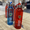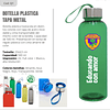 Botella plástica traslúcida en distintos colores con tapa de acero inoxidable y cinta transportable del mismo color de la botella. Incluye silicona antiderrame. Libre de BPA.